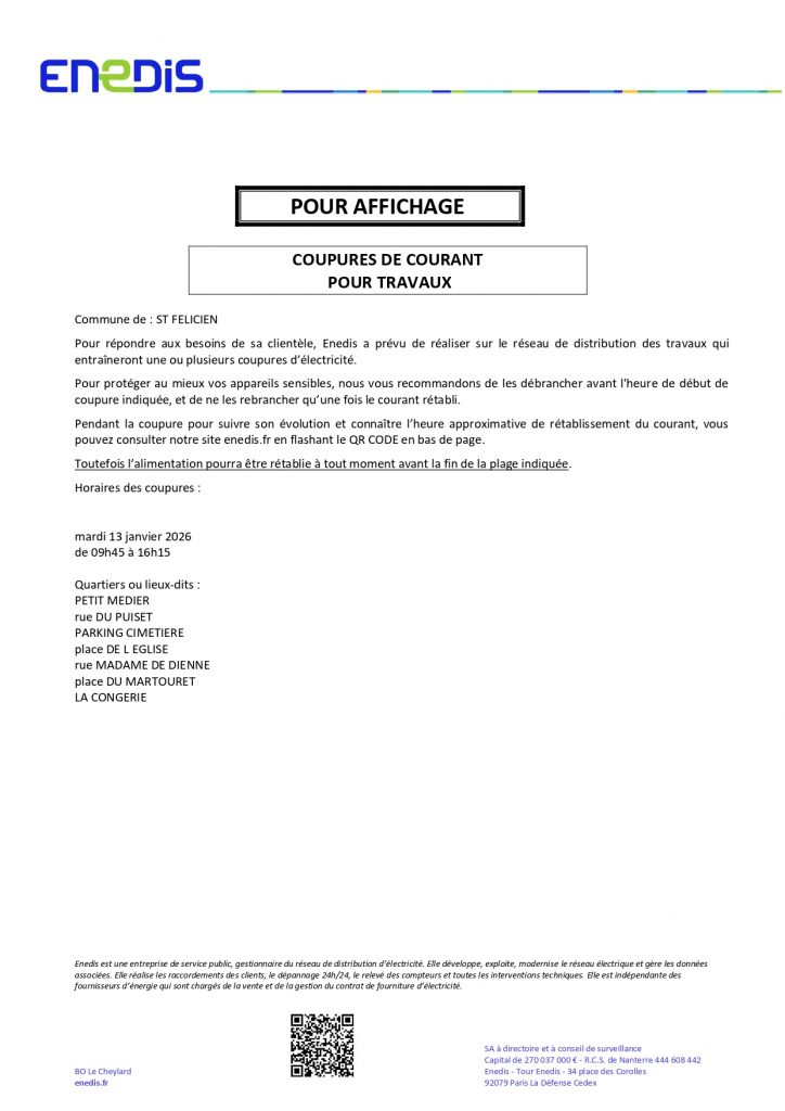 Coupure d’électricité le Mardi 13 Janvier de 9h45 à 16 h15 pour les Quartiers ou lieux-dits :