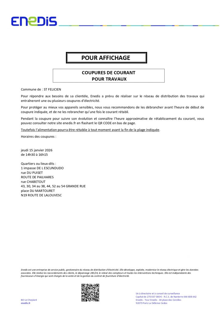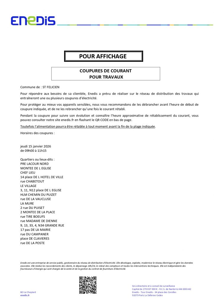 Coupure d’électicité le JEUDI 15 janvier pour les Quartiers ou lieux-dits :