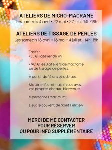- 90 € pour les 3 ateliers de macramé ou les 3 ateliers de tissage de perles