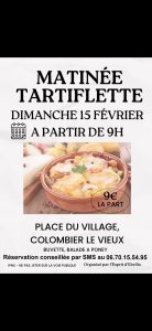 Matinée tartiflette le dimanche 15 février  à partir de 9h sur la place de Colombier le vieux.