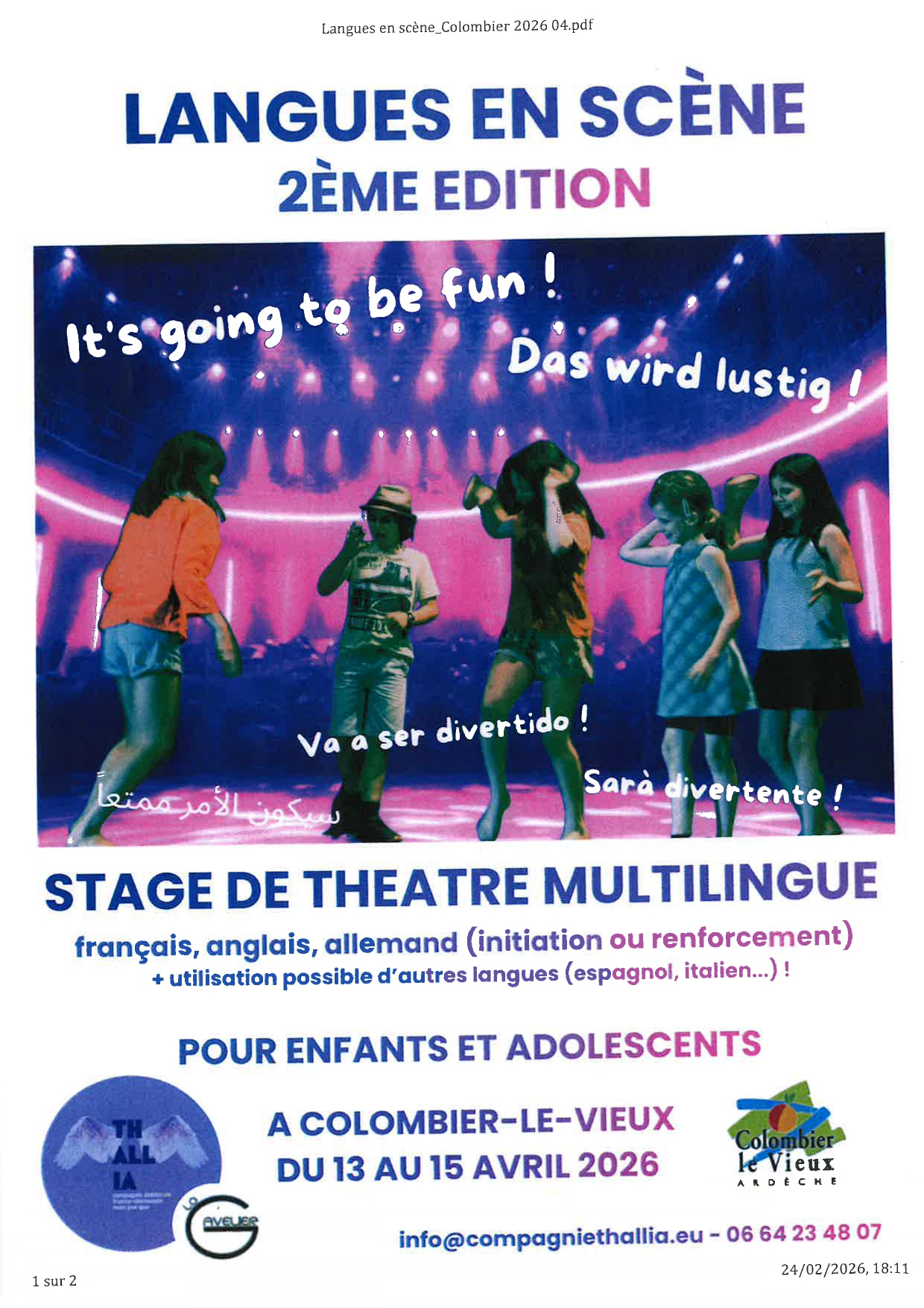 DU 13 AU 15 AVRIL STAGE MULTILINGUE POUR ENFANTS ET ADOLESCENTS à COLOMBIER LE VIEUX de 10hà 17h à la salle culturelle 12 € par enfant Inscriptions ou info à : [email protected] ou au 06 64 23 48 07